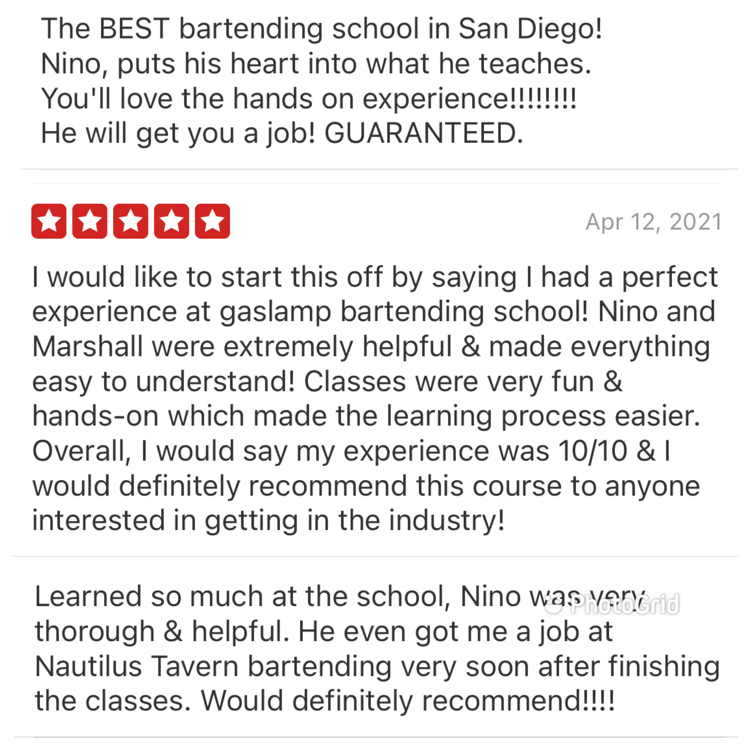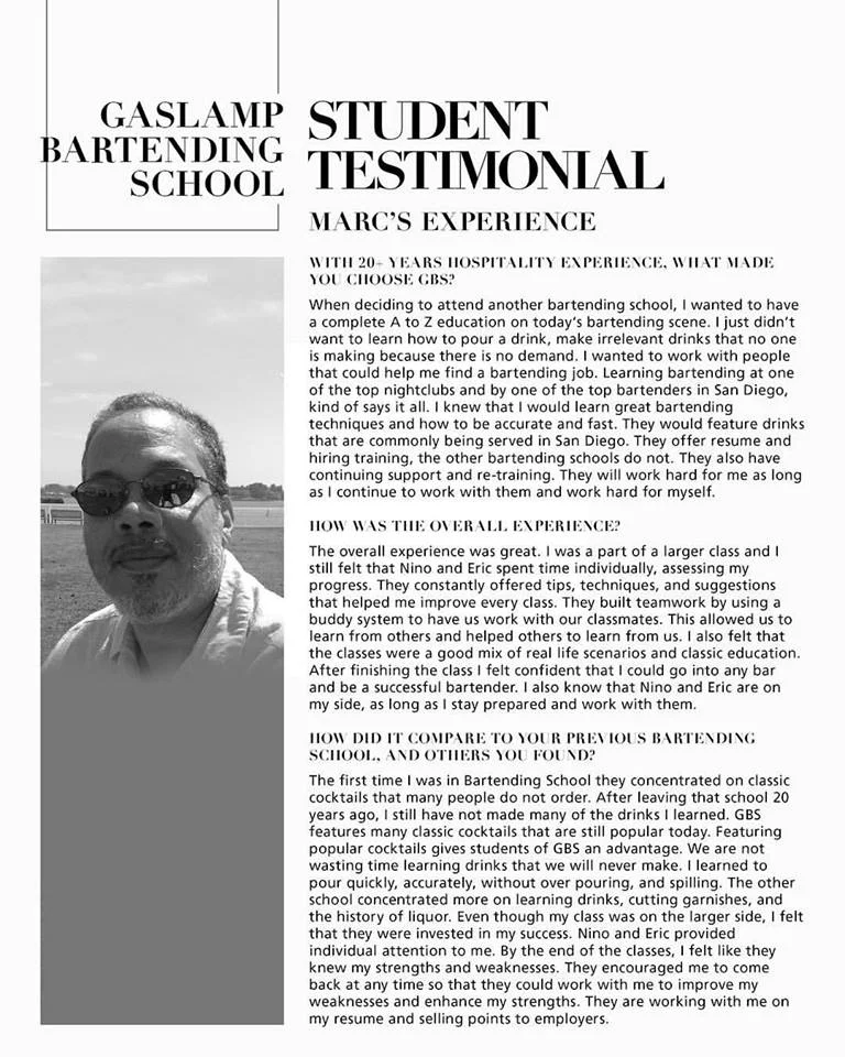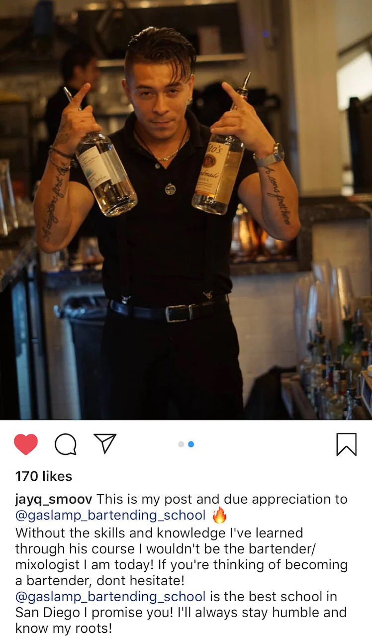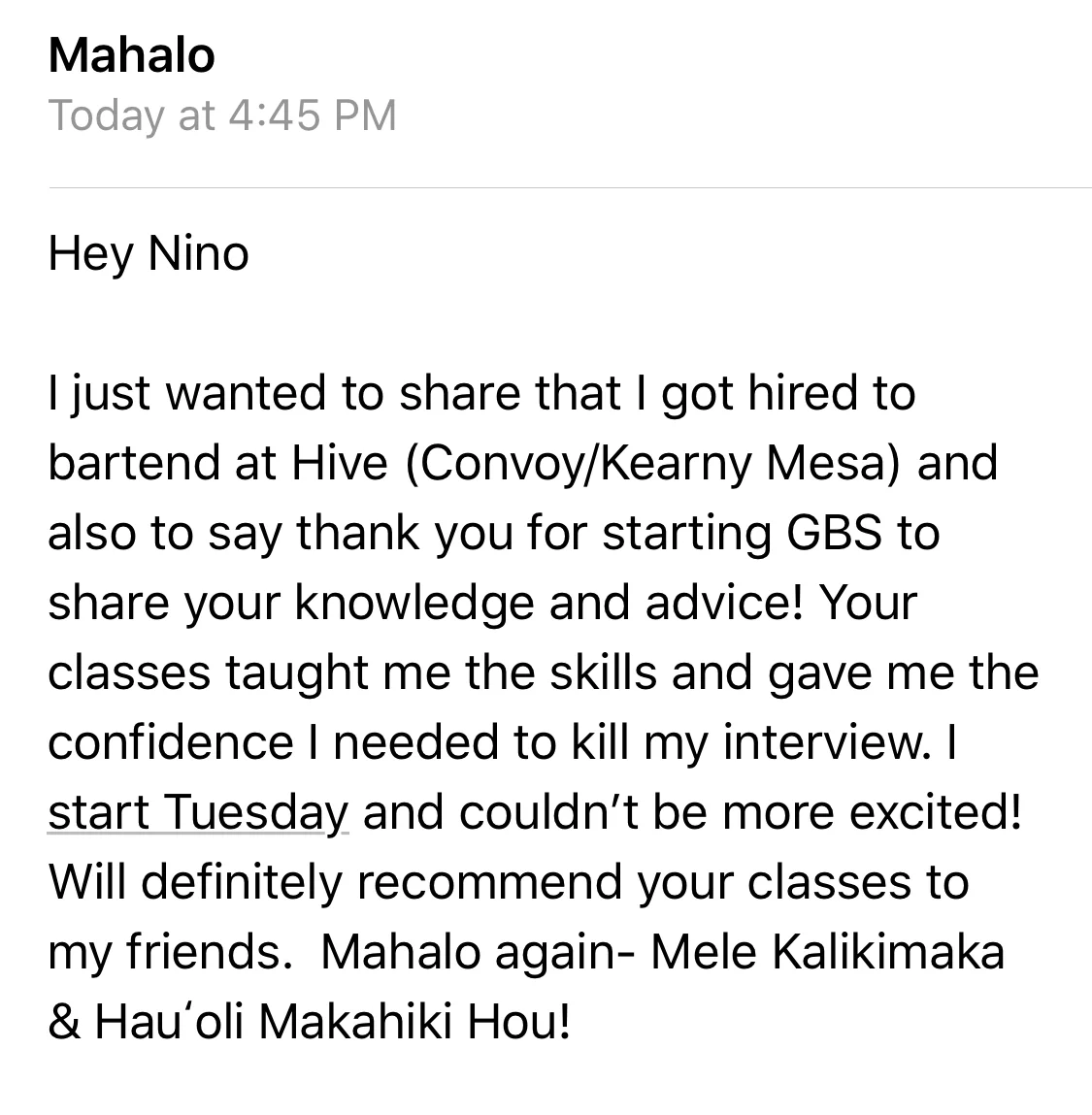 “I just got hired as a bartender at the La Jolla Playhouse with interview i got from GBS. It took me two weeks to get hired! GBS even got me a night to bartend at El Chingon (voted 2018 best bar) in Gaslamp. I had 2 other students with me, it was an amazing experience.