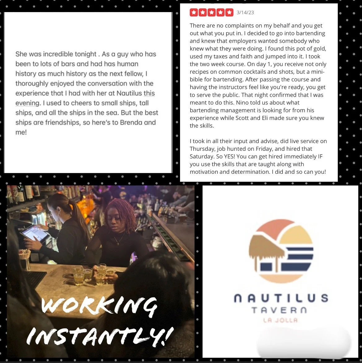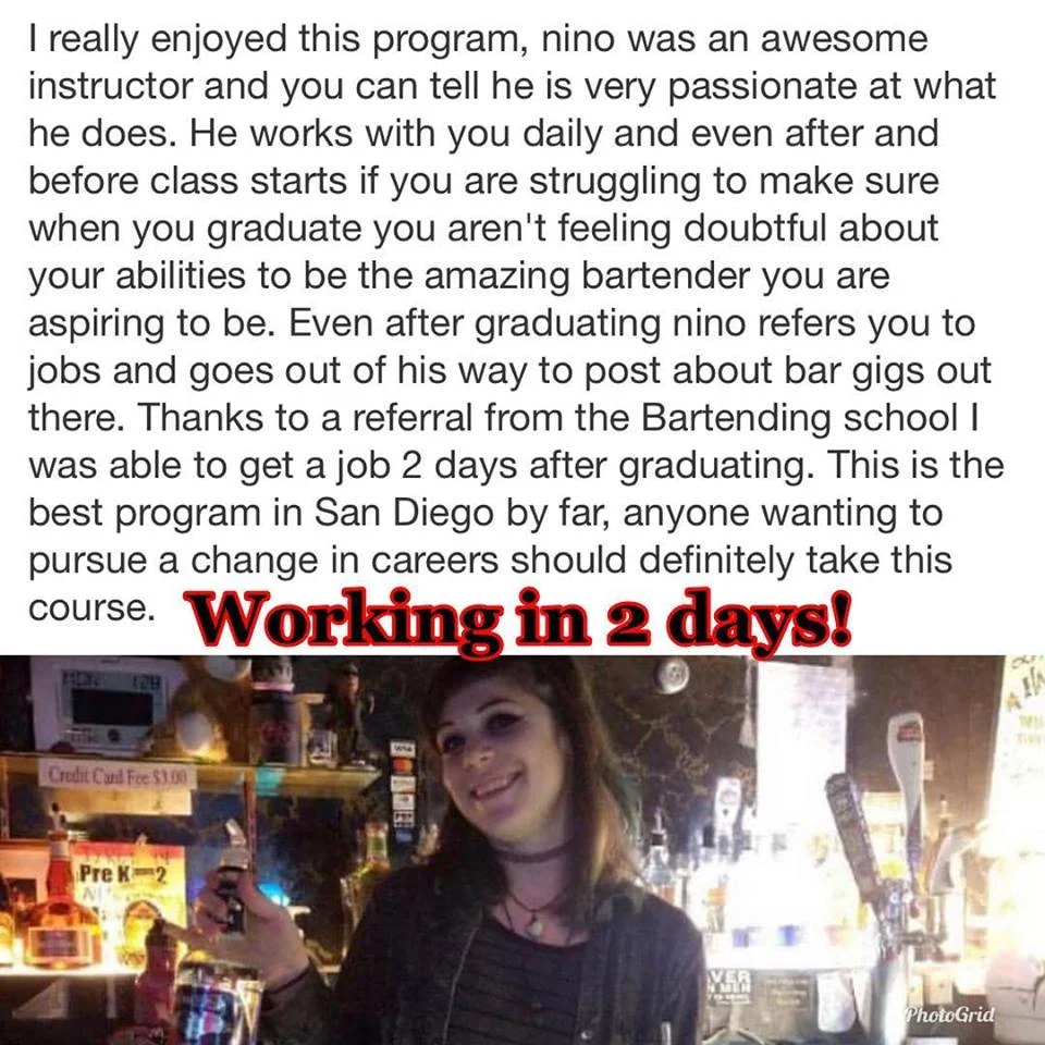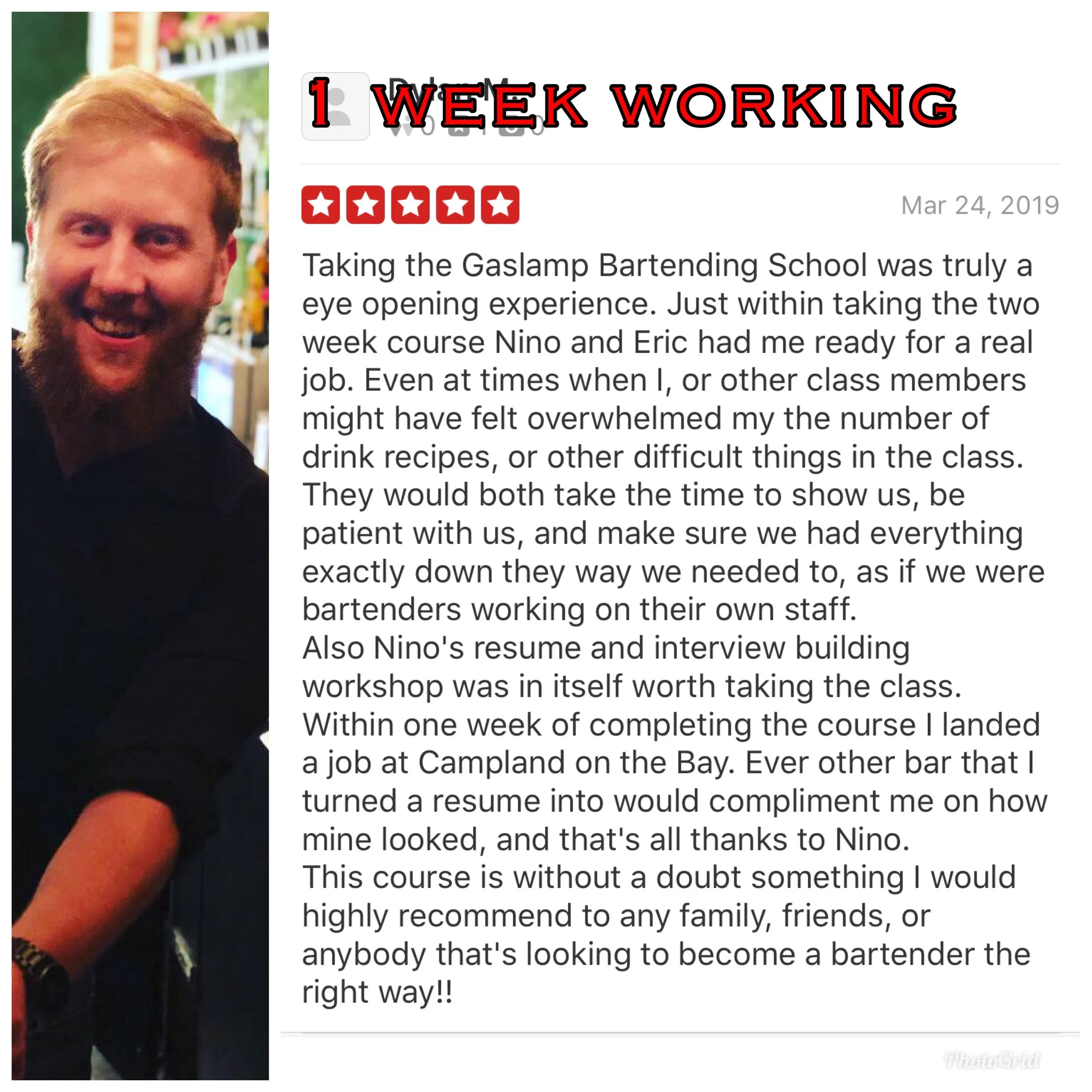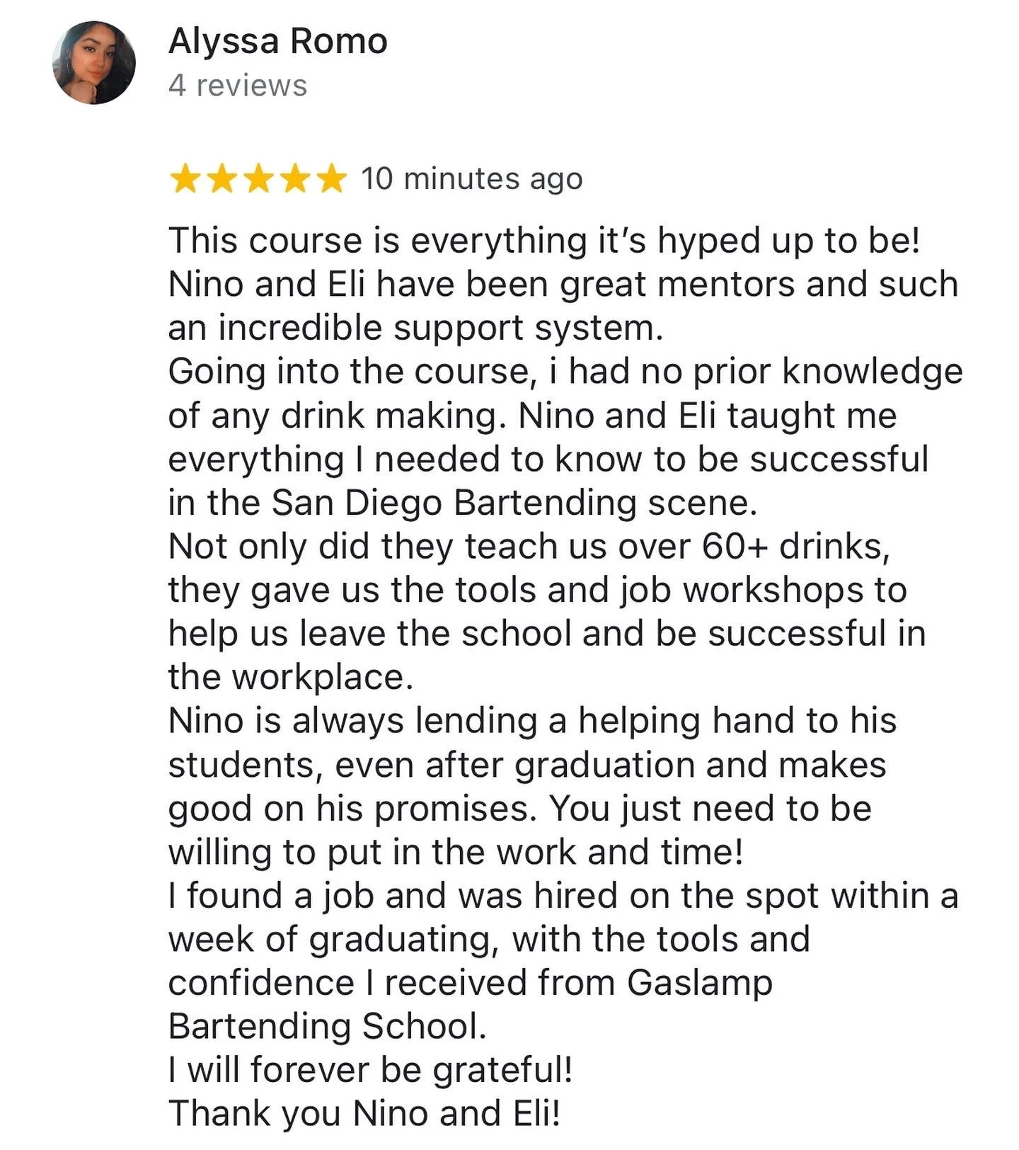Yes, I am currently working as a bartender in Coronado, at a Mexican restaurant called Candelas on the bay, VYBZ and El Chingon in Gaslamp. After finishing the GBS course I started looking for a job and I got my first interview in 2 weeks.