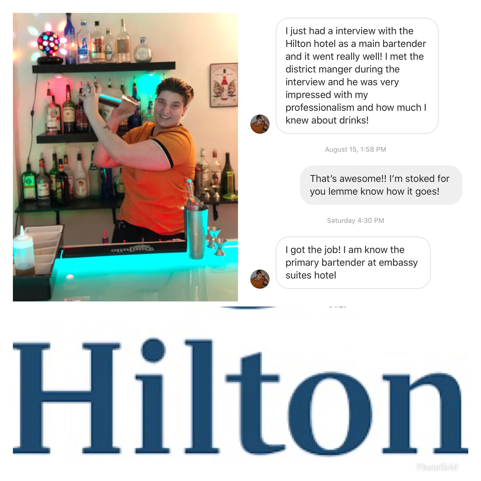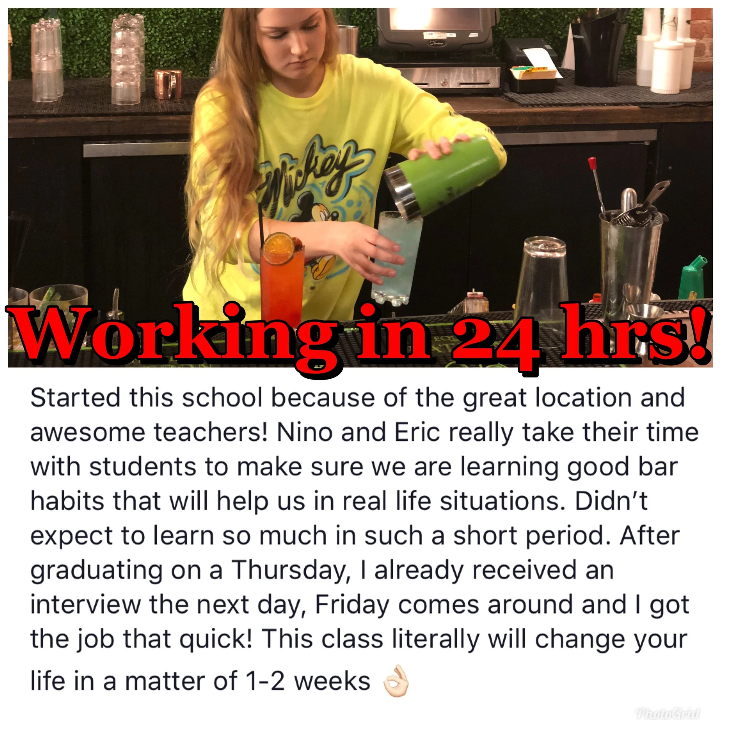 It gave me enough self-confidence to say I am a bartender and the interviewing skills i learned in class where huge! The job workshop was essential to my rapid success.