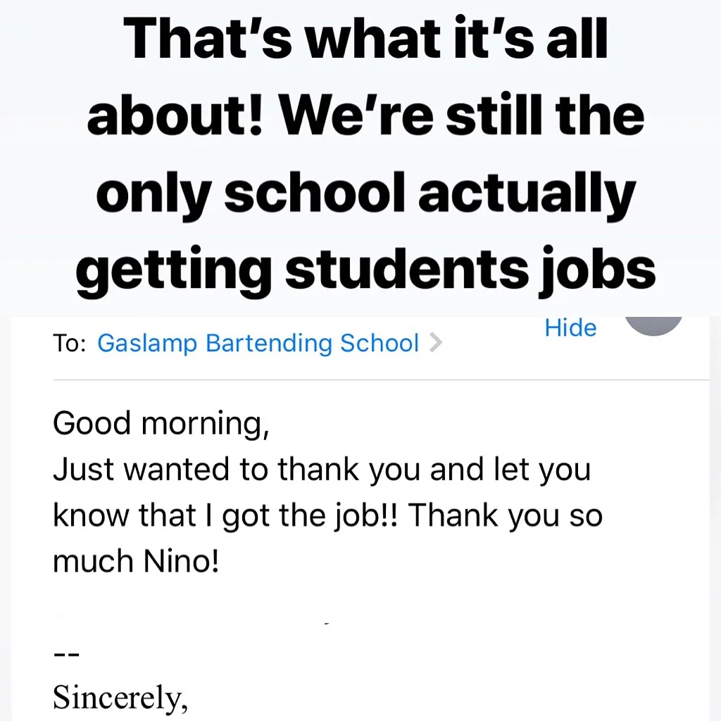 Yes, I’m currently a bartender/ bar manager at Saigon on Fifth and recently landed a bartender position at SOHO Gastropub near Kearny Mesa. I applied for 3 bartender positions (Saigon on Fifth in Hillcrest, Campland Raised Cantina (a job interview provided by GBS) in PB, and a Star Bar in downtown) right after I finished the bartending school and was hired within 3 days of graduating. All required at least a year experience but i still got all 3 jobs in less than a week. I had to quit 2 of them to go full time as a bartender/ bar manager at Saigon on Fifth.