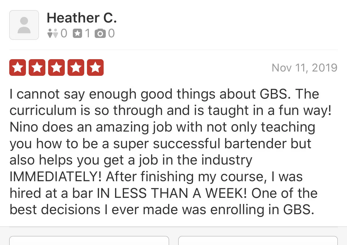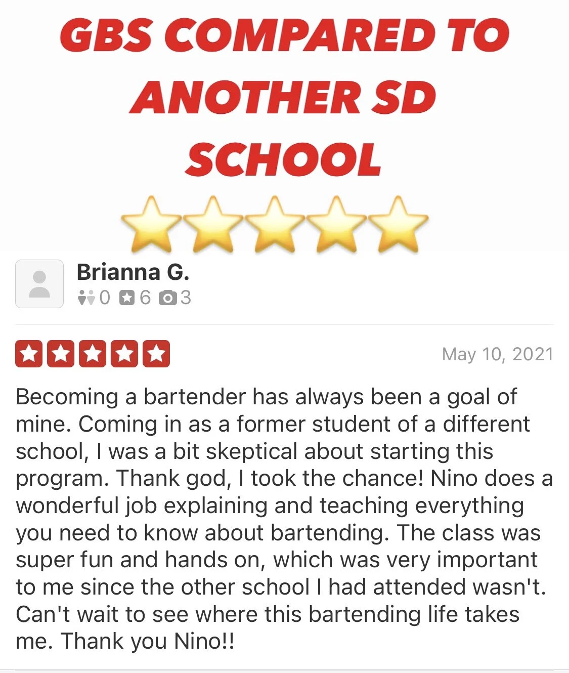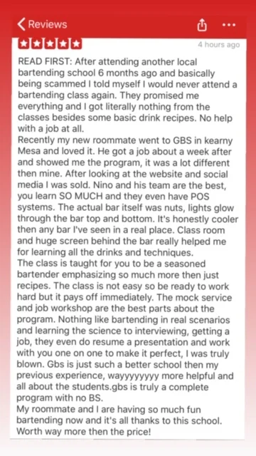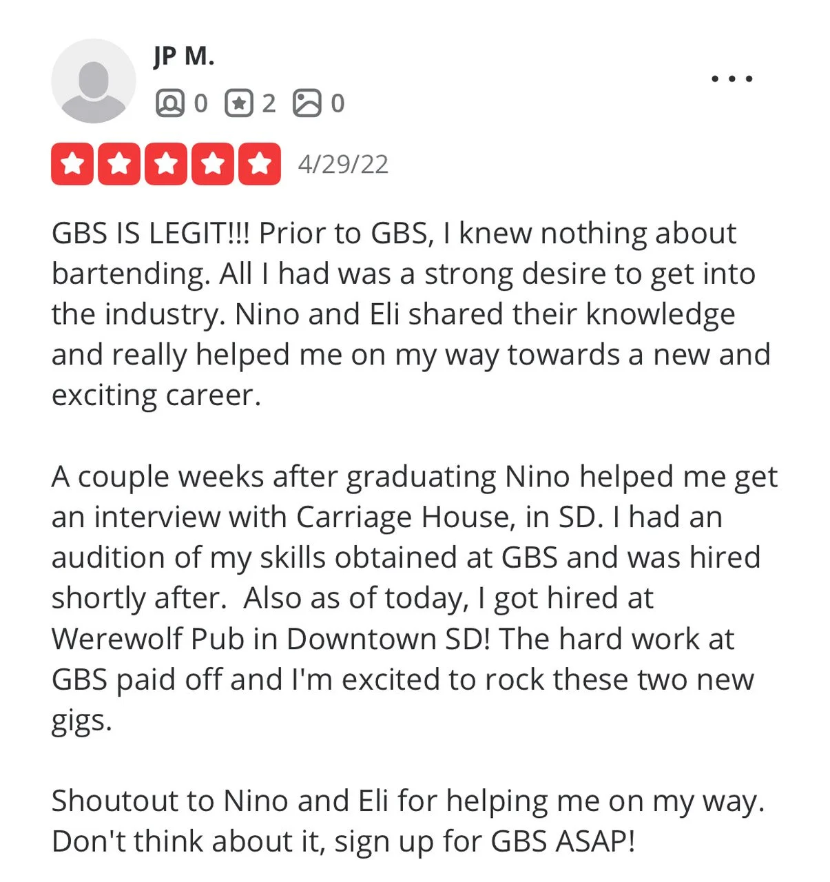 I chose GBS because thy had great YELP review and it turned out to be true what people were commenting. They try their best to get you ready and teach you so much and help to get a job. I’m living proof that GBS is legit!! Thank god for GBS!! I wouldn’t be a bartender without it!"