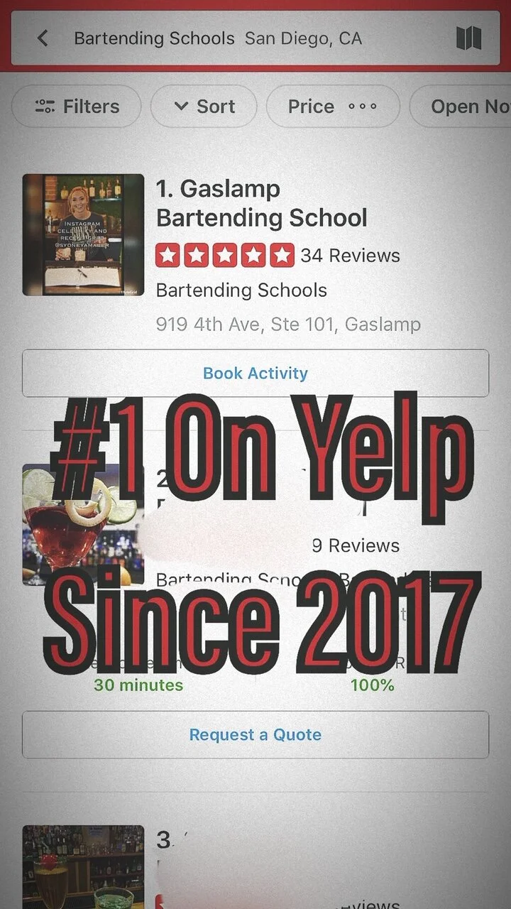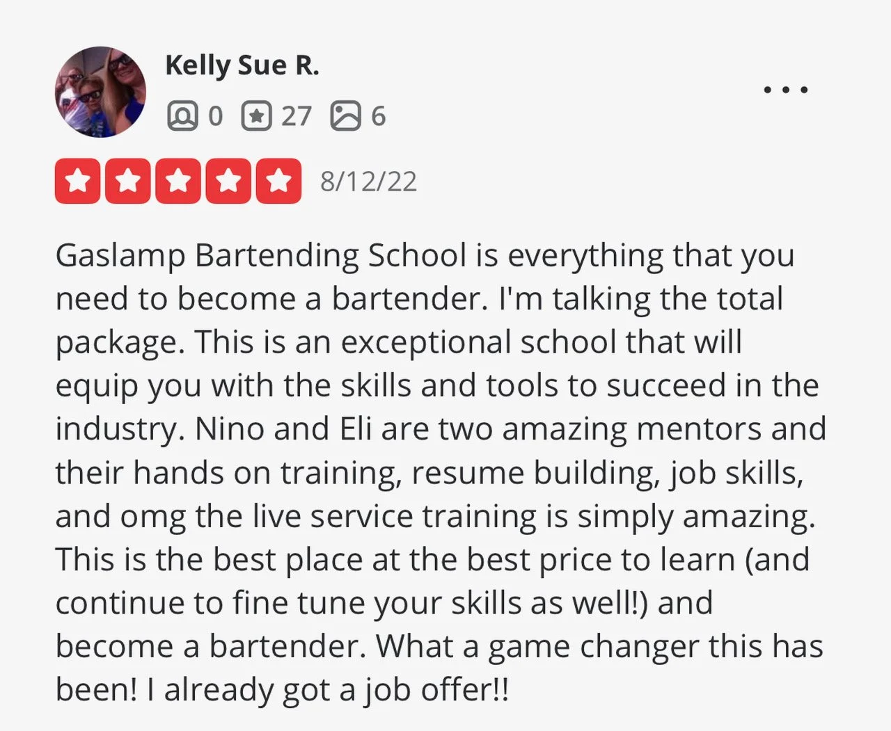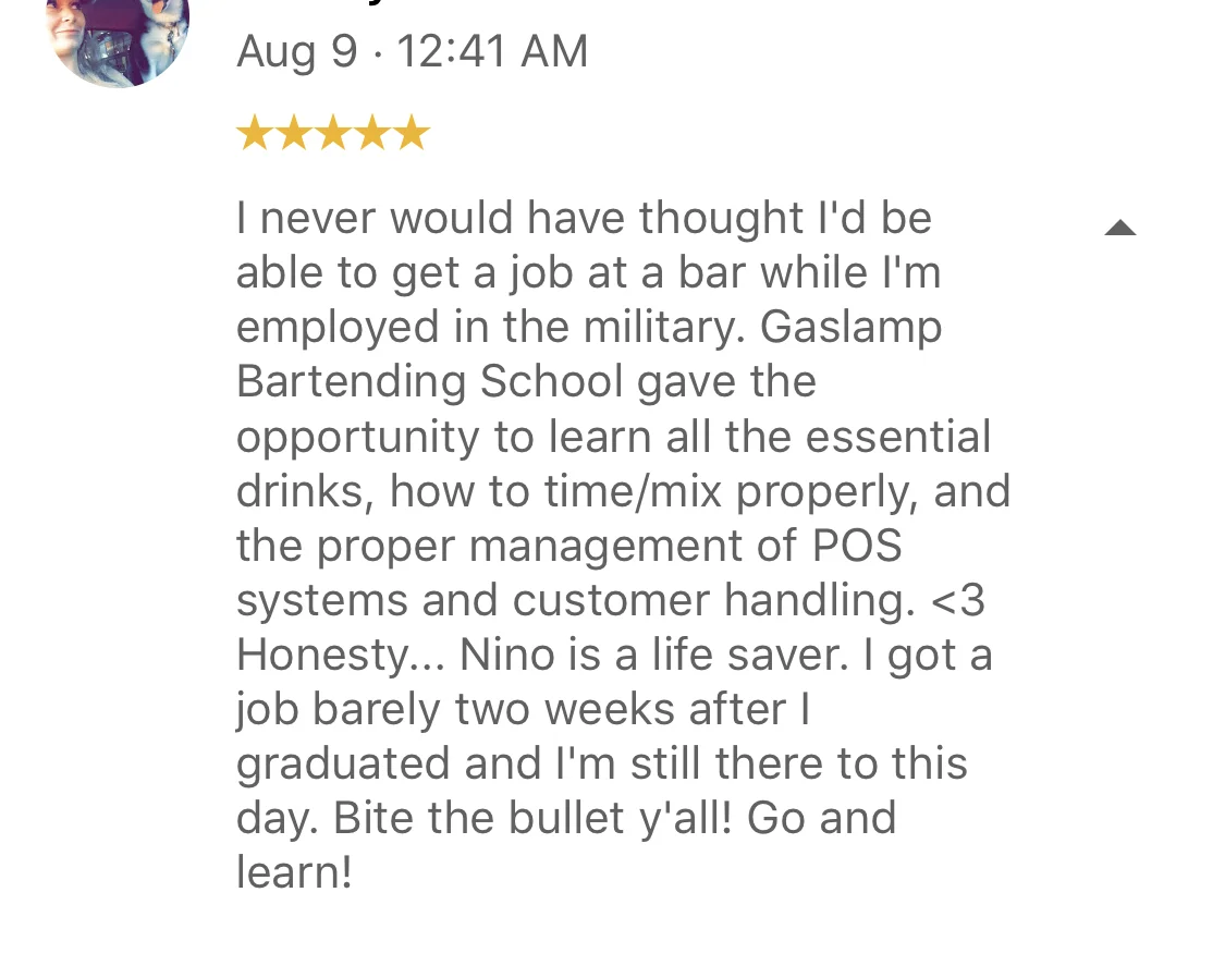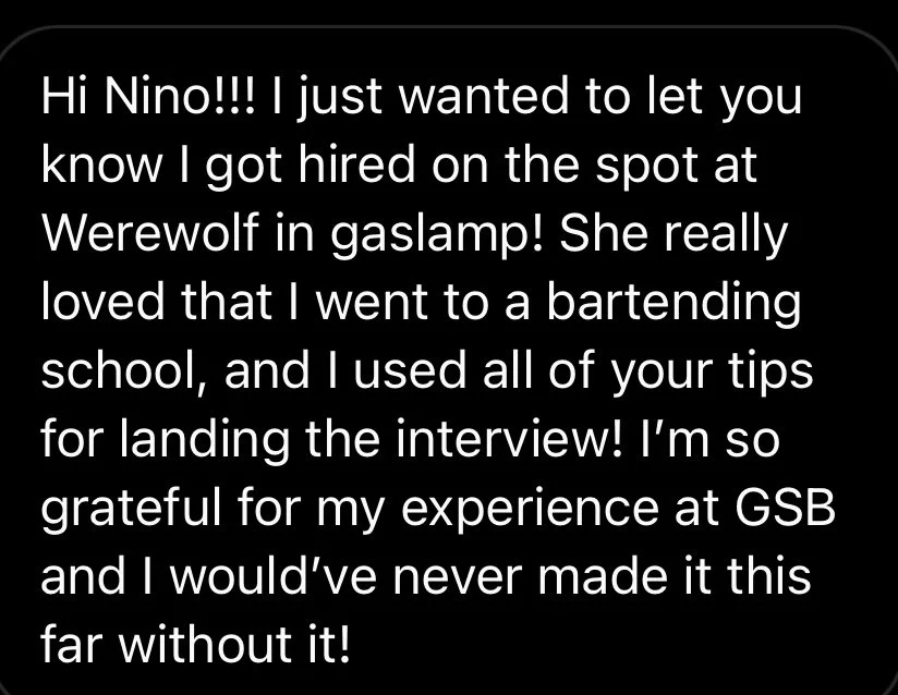 I chose GBS because thy had great YELP review and it turned out to be true what people were commenting. They try their best to get you ready and teach you so much and help to get a job. I’m living proof that GBS is legit!! Thank god for GBS!! I wouldn’t be a bartender without it!"