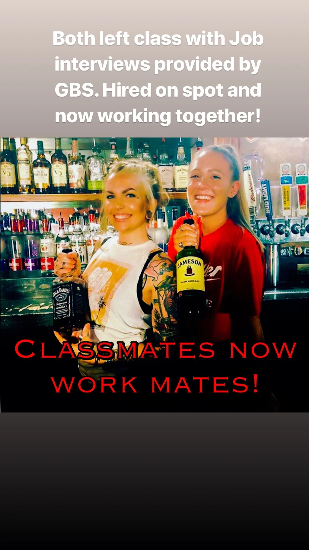 " I'm currently working at 2 bars. After GBS I got my first job 4 days later. GBS helped me get a job by teaching me how to set up my resume **BIGGGGG bonus with taking the classes. My first bar was only a beer bar but GBS helped with how to dress/talk/set up my resume so I was prepared."