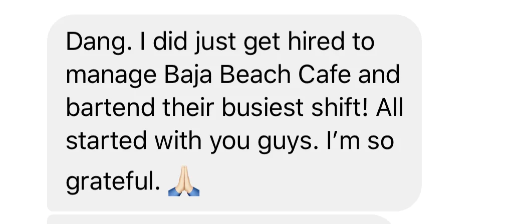 A very detailed resume lecture is followed up by students sending their re-formatted resumes for critique and feedback. This workshop is meant to show you everything you need to know to land a job with no help. Some pay just for the workshop. Carefully crafted with decades of bartending and bar managing experience, you simply will not find anything more helpful to fully prepare you for the competitive field of bartending. From what students learn here they find themselves working in days without any GBS help. Most these stories on this page are the result of this workshop.