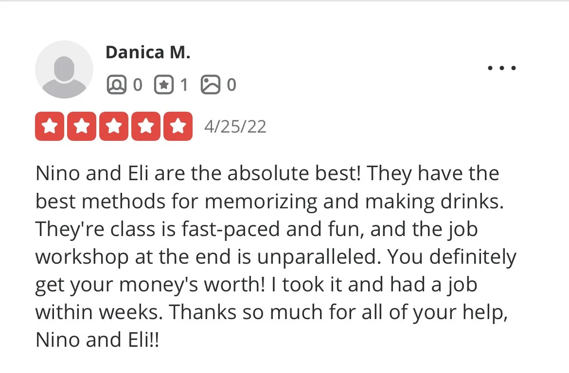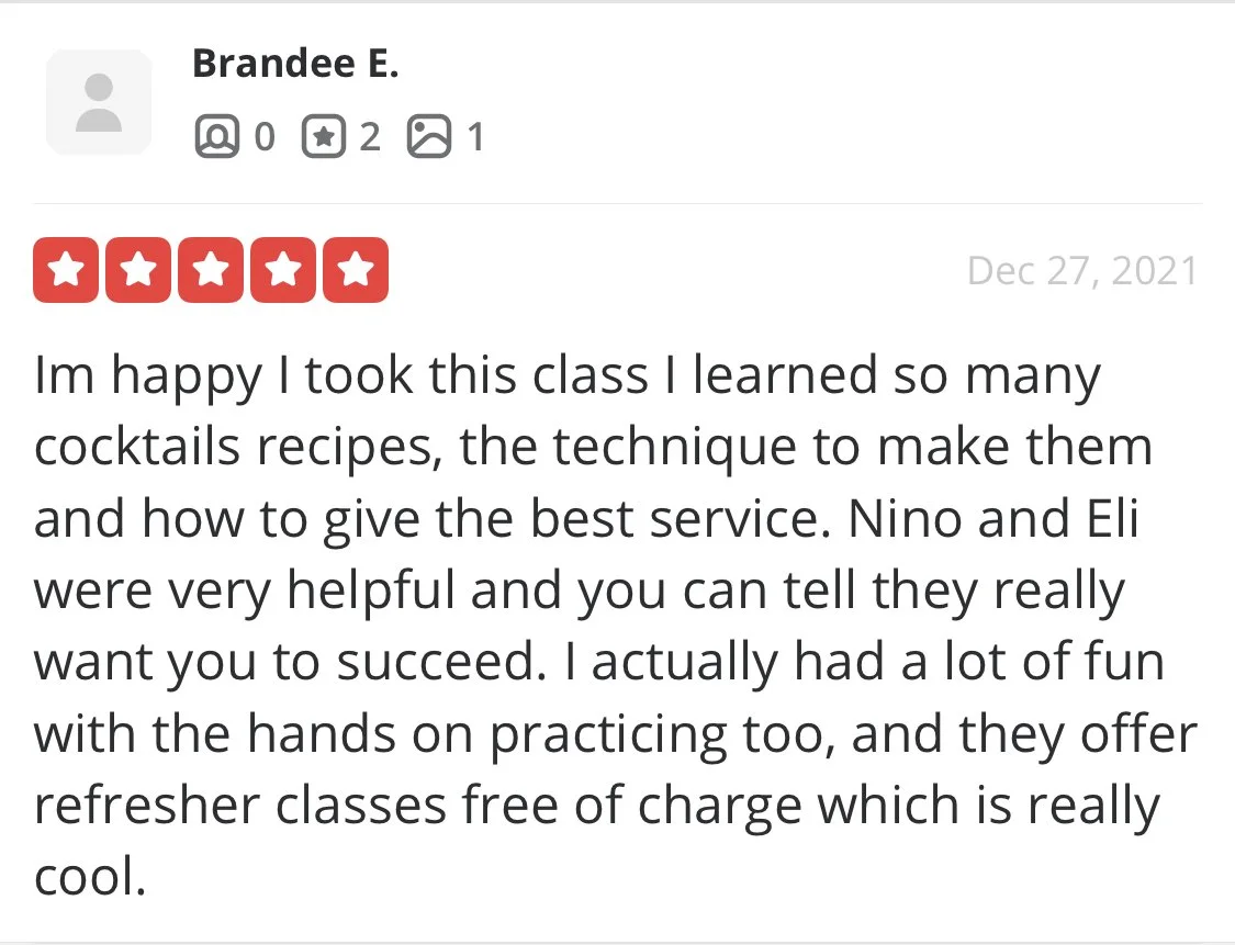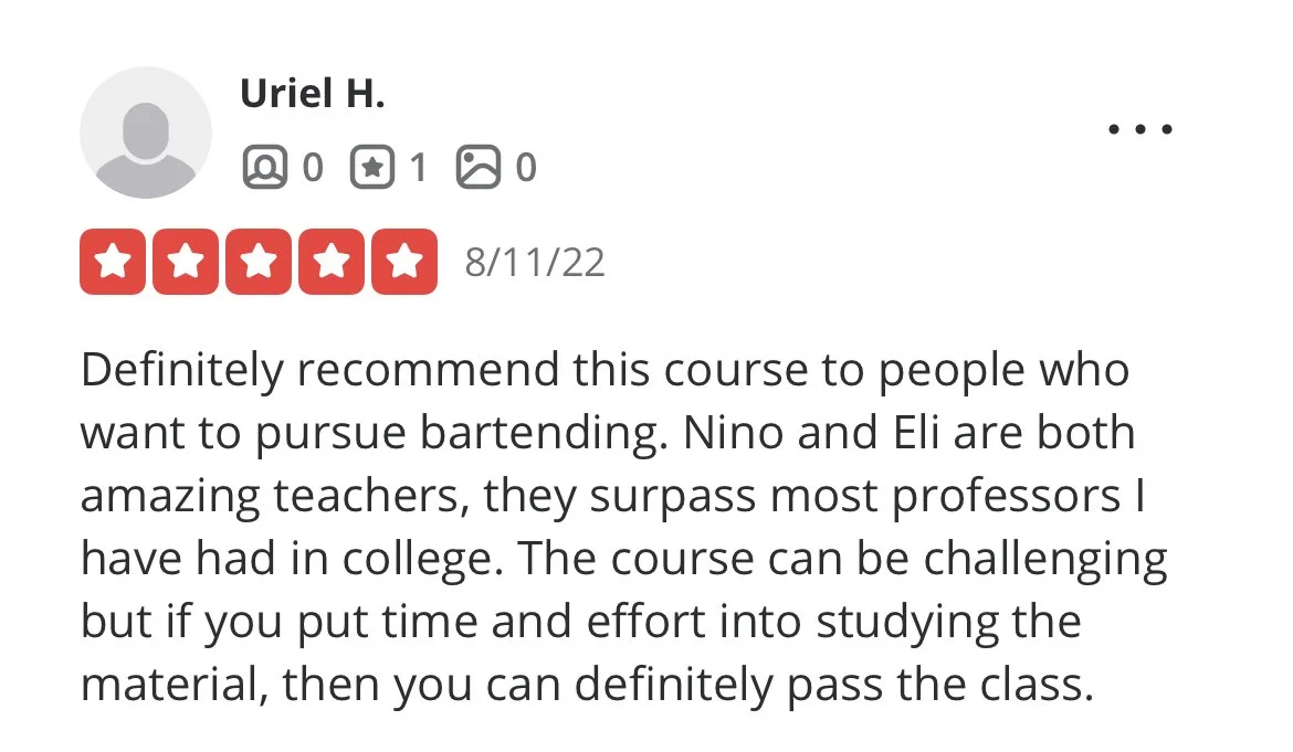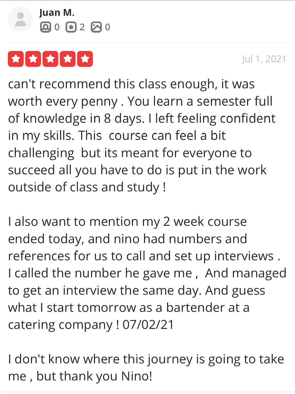 Nino and Eric are both great instructors and have tons of tips and tricks to share. I honestly grade this overall experience a 10/10 it over exceeded my expectations for sure. I’m happy i took the class and would recommended it to anyone looking to start a bartending career!