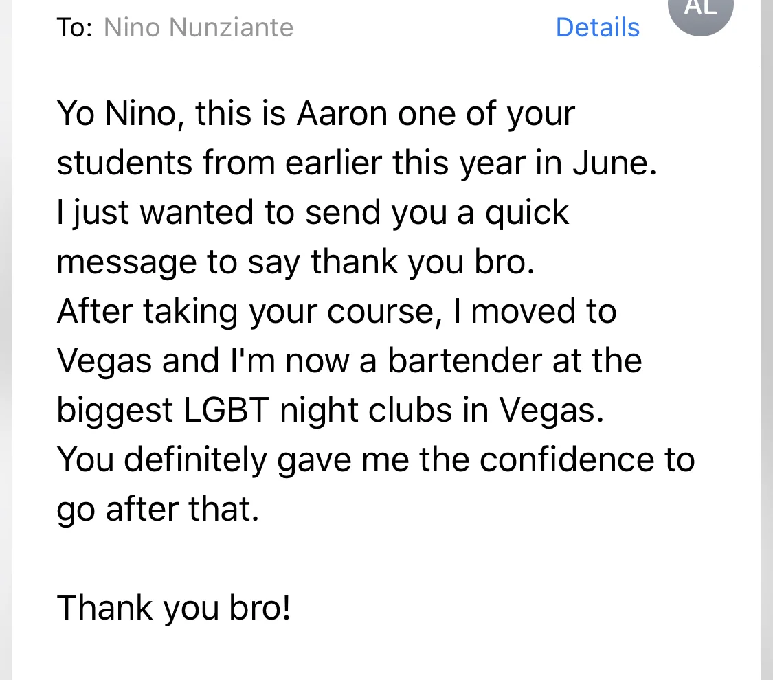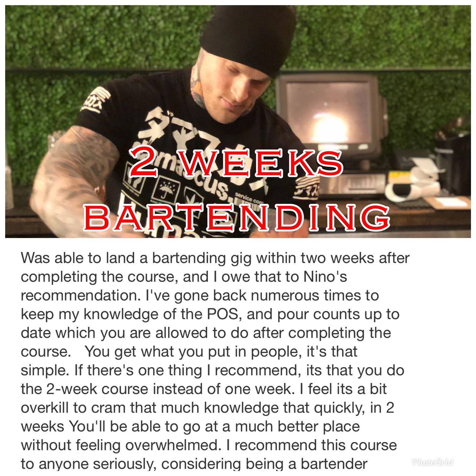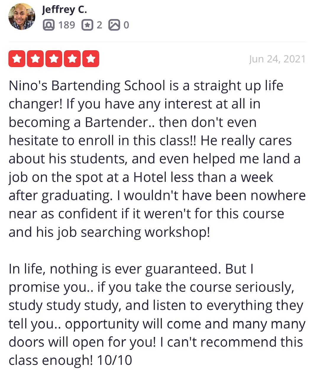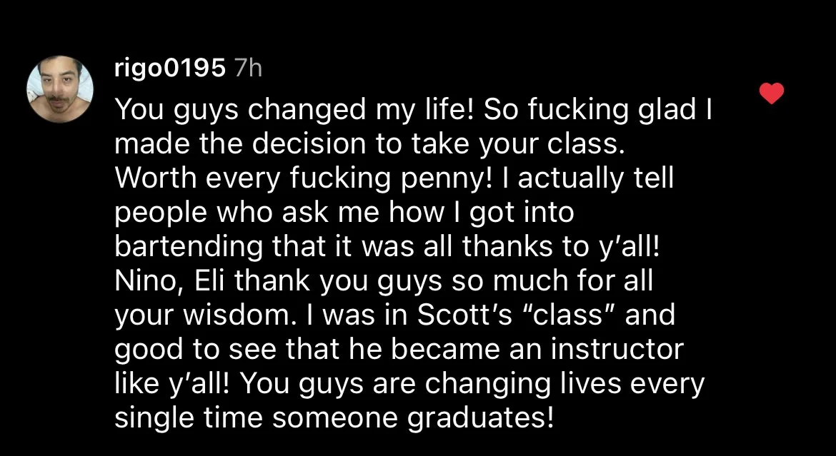 Nino and Eric are both great instructors and have tons of tips and tricks to share. I honestly grade this overall experience a 10/10 it over exceeded my expectations for sure. I’m happy i took the class and would recommended it to anyone looking to start a bartending career!