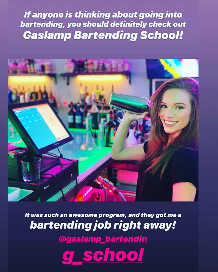"I am currently bartending at Mavericks Beach Club in Pacific Beach, I was hired the week after I finished my course with GBS. GBS taught me everything I needed to know to get started. Recipes, how to pour drinks quickly and efficiently, and all the little details. I was confident going into my interview with the help I received creating my resume and learning about possible interview questions. The skills I learned at GBS have been monumental in my success. I wouldn’t be able to bartend at such a high volume venue without the fundamental skills and tricks I learned at GBS.