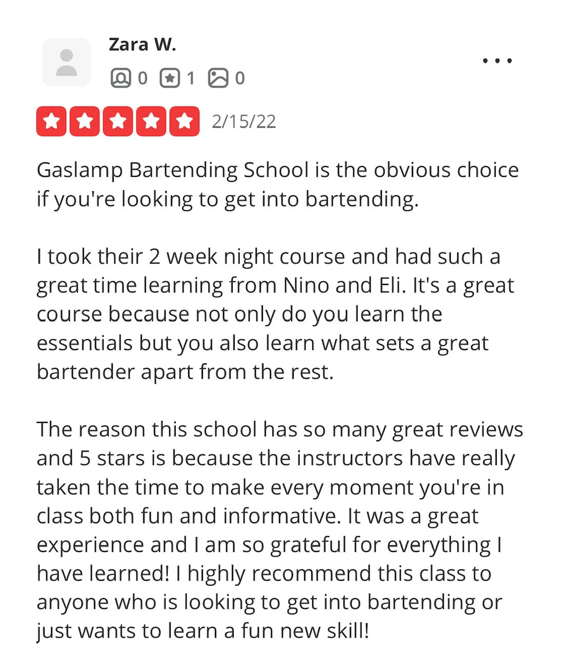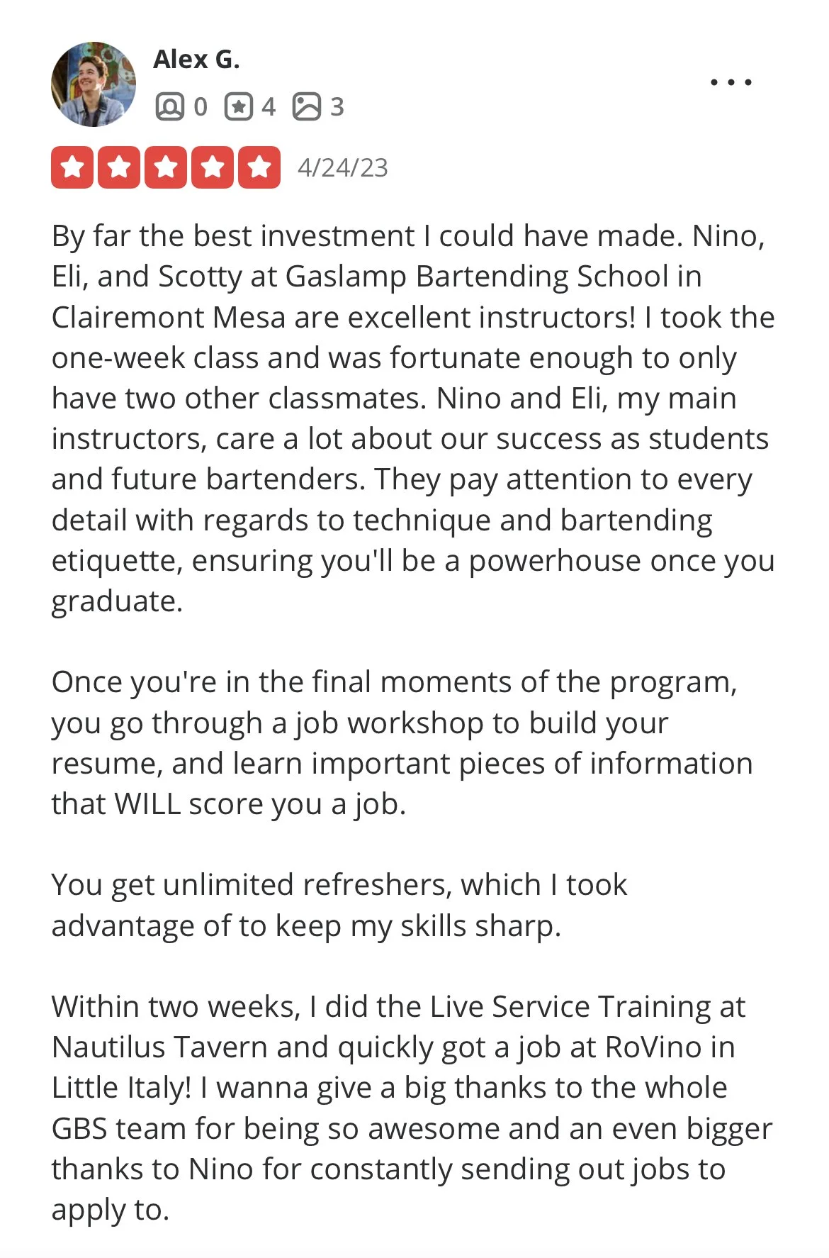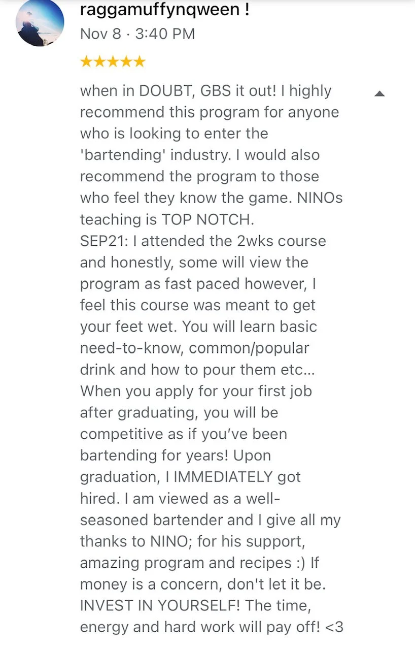 I chose GBS because after doing the research, it hit all of the points I was looking for in a bartending school. After the first day of class, it really exceeded my expectations. The price is worth it because not only are the tools they provide you necessary for your success, but even if you dont work their events you’ll make the money you paid for the program back within your first couple shifts as a bartender. Nino and Eric are amazing role models and they’re well established in the industry. They provide you with the feedback you need in order to excel in the industry, they’re a great reference, and they provide a fun and friendly environment to help you work towards your goals. Overall, I give this school 5/5 stars! 🌟🌟"