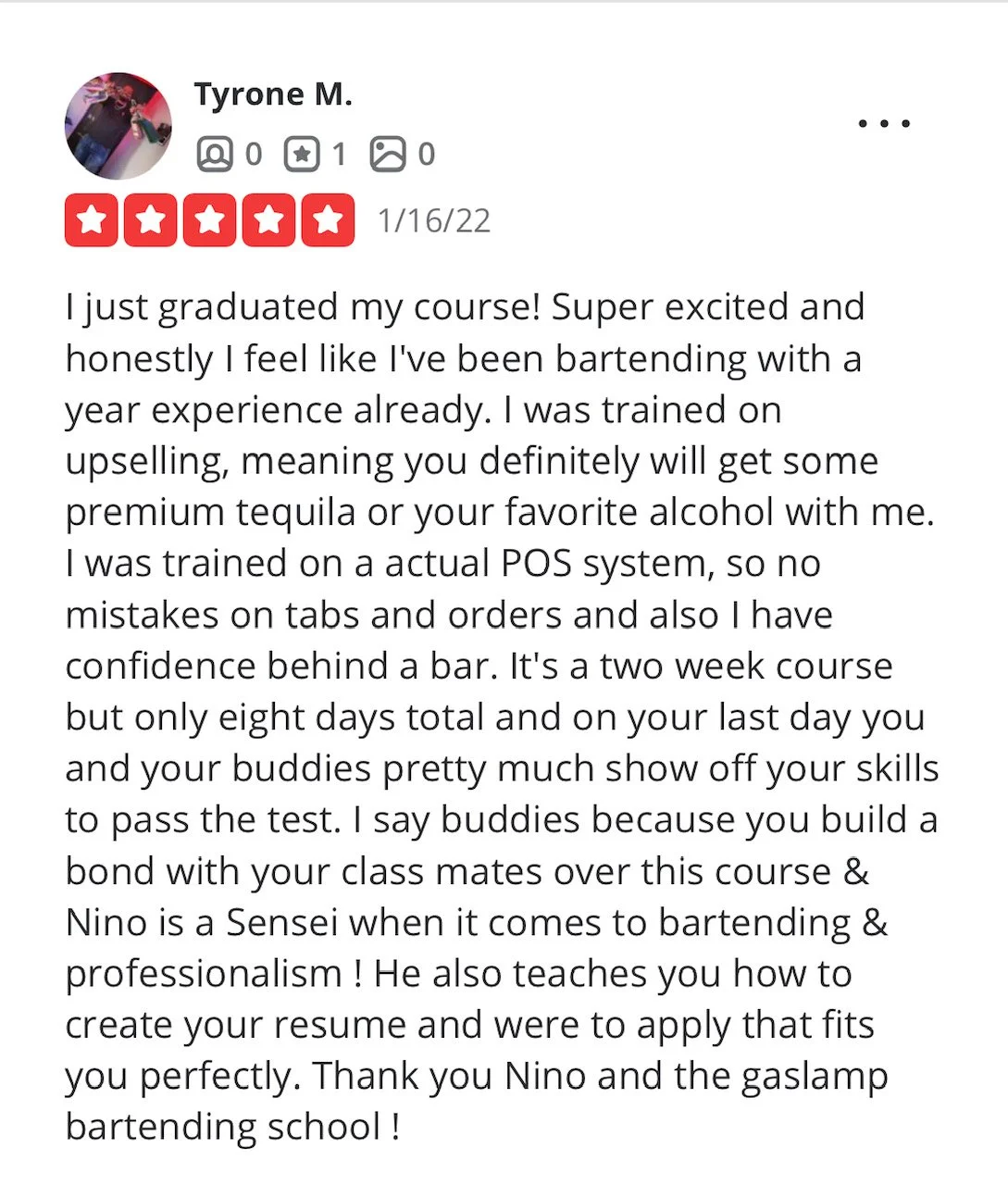 I chose GBS because it offers training in an actual nightclub, using a POS system and mock practice serving drinks. I found it to be very well-rounded training that covered all the basics and enabled me to go from practically zero knowledge and experience to starting my bartending career in literally a few weeks. Nino was amazing and I would recommend this bartending school to anyone"