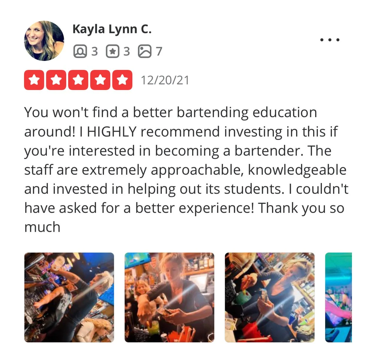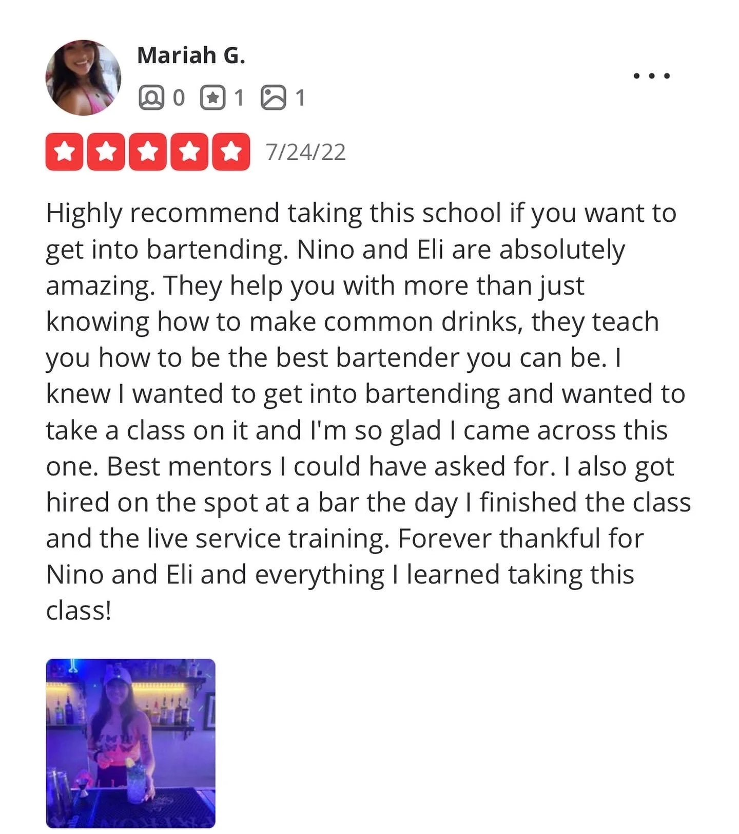 Heather (above) Yelp review (below). She took our 2 day crash course and then added on with our Job Workshop-Bar Staffing package! Working in days!
