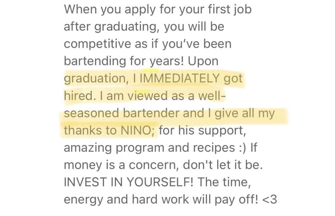 I knew exactly how to prepare for my interview thanks to Nino’s excellent day of class dedicated to resume-writing, job hunting and interviewing. Plus, thanks to all the behind-the-bar practice and tips for remembering recipes, I aced my pour test!